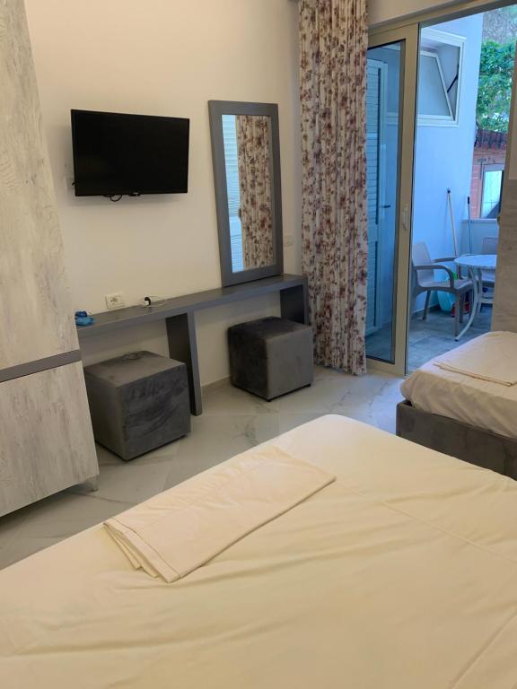 "Vi havde lejet 2 lejligheder på hotellet. Den ene var rimelig udrustet til fx at lave mad og spise, mens den anden var sparsomt equiperet. Vi spiste i lejligheden et par gange. Det fungerede fint. Deres belysning overalt i lejligheden er skrækkelig - men det lader til at være sådan man møblerer. Lyset var skarpt og koldt LED lys i alle rum. Toilet/Bad var ikke luksuriøse, men rene. Aircon. virkede i alle rum, men nogle bedre end andre. Vi brugte det ikke. Sengetøjet var rent, sengene meget hårde (Tror det er typisk for Albanien). Der var en del myg, som vi ikke kunne holde ude trods net og lukkede vinduer. Rengøringen var ok, blot man ikke flyttede rundt på møblerne."