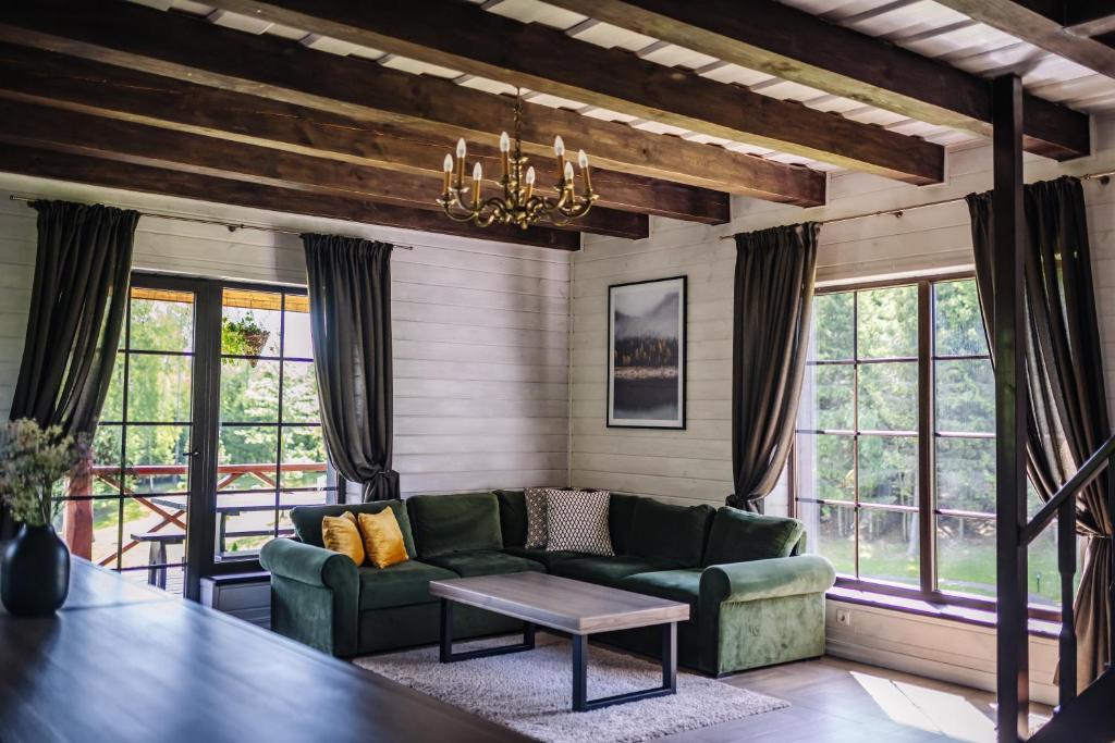 "Тихе та мальовниче місце, частково в лісі та на березі озера. Обладнаний усім необхідним будинок з 3-ма спальнями, 5 двоспальних ліжок, затишна вітальня, велика тераса. Окремий будинок з сауною та гарячим чаном. Привітний персонал, який допоміг з вирішенням наших питань, що не стосувалися перебування у комплексі."